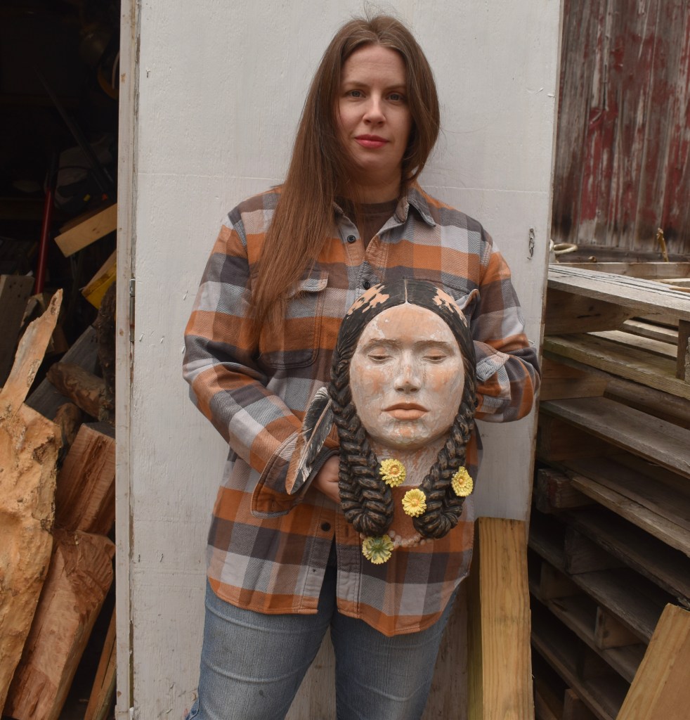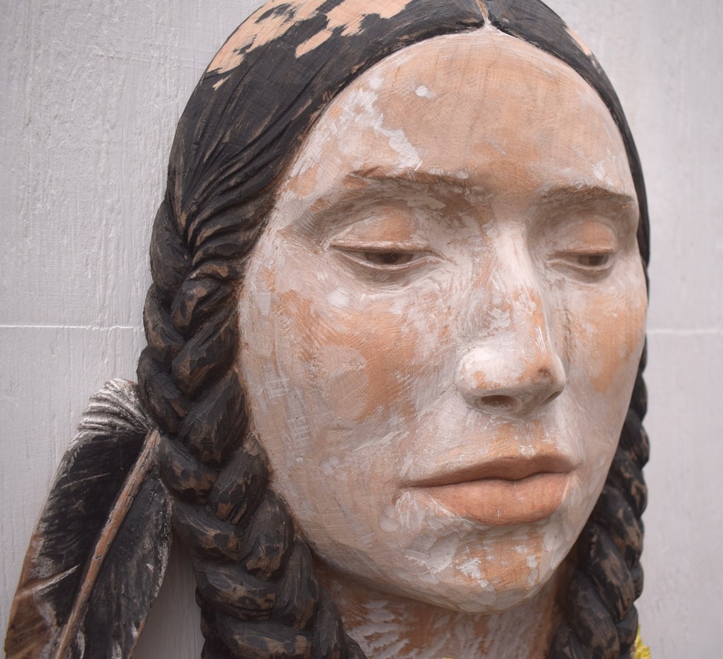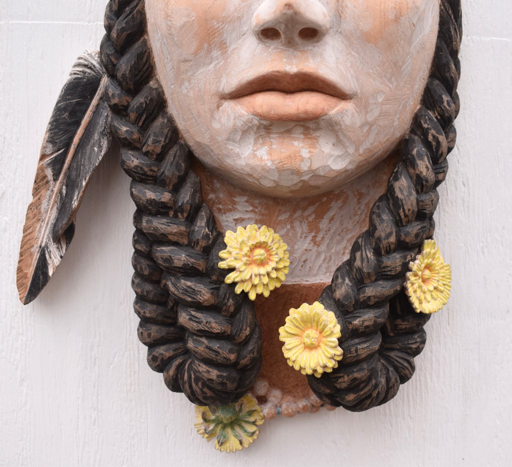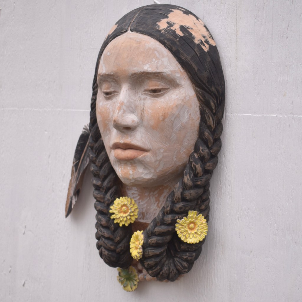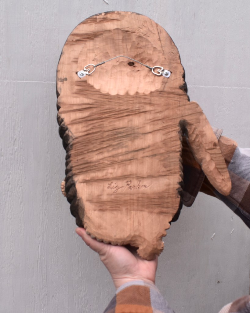 Carved from one solid piece. I’ve left three marks, untouched from where they were first cut in order to relieve the piece from the original log located on the nose, brow and feather. It was scrap from another sculpture. The face is placed so tightly within these confines that there was no wiggle room given in order to make the most of the material and make this work as large as possible. I enjoy the intentionality and precision of this as my carvings are created freehand with chisels and mallets, with no measuring tools or devices. Freehand is the most liberating way to make anything. So these marks are like bragging rights to me.