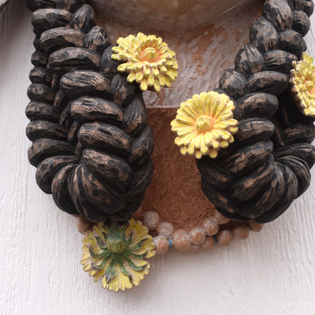 Unlike the main subject of this work the dandelion is a more recent edition to our continent. It may have been brought in 1620 by the Pilgrims on the Mayflower, or by Jamestown settlers, or even earlier with the Spanish. When I began this work the dandy lion for me was a symbol for the overlooked or under appreciated. However through the course of creating this sculpture it began to make me think of an unintentional duality. It is both a charming flower and a nusome weed, careingly cultivated for food, medicine and beauty, at the same time an unwanted intruder that spreads wherever it wills. In the context of this sculpture I think it can represent people, like the people who brought it here to America. I’d like to imagine it being recieved by the native people with a bit of wonder or imagination as they consider something that they had never seen before with fresh, inquisitive eyes, ready to appreciate if for all it has to offer. But the good and the bad are wrapped up together in it, and its cheerful face later becomes sober and remorseful till it is finally blown away with the wind.