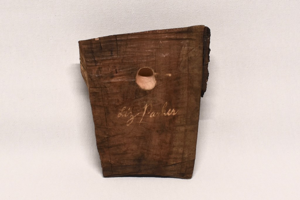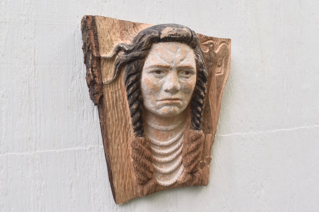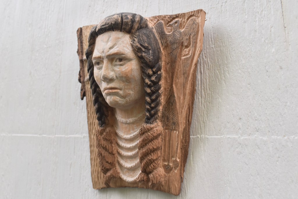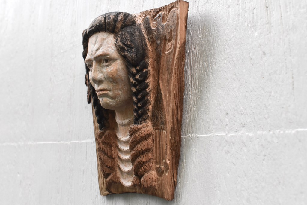 Hand carved in red oak, finished with gesso, acrylic and colored pencil