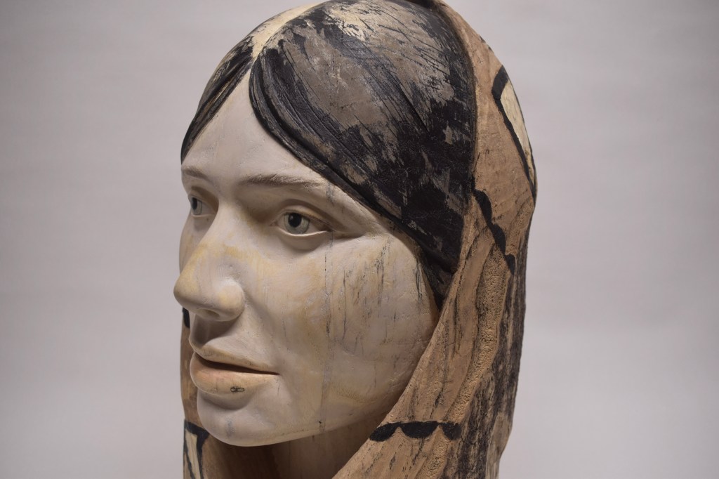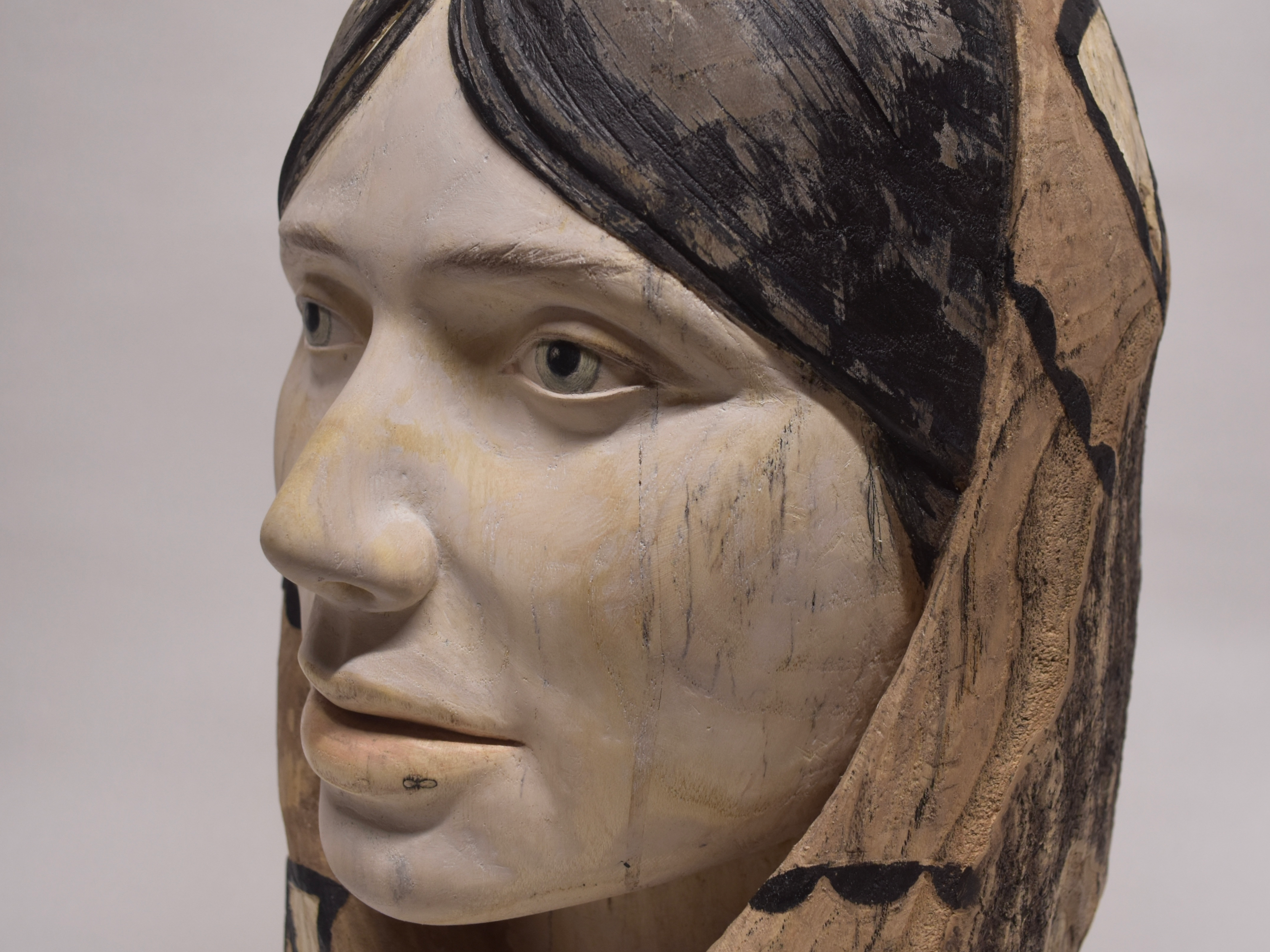 Hand carved in red oak, finished with gesso, acrylic and colored pencil